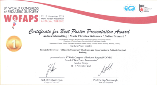 In der Zeit vom 12. bis 15. November 2025 fand der Weltkongress der Kinderchirurgie in Antalya statt. Dort waren 571 Kinderchirurginnen und Kinderchirurgen aus mehr als 80 Ländern vertreten und diskutierten zu verschiedenen Themen der Kinderchirurgie. Die Kinderchirurgie und Kinderurologie unseres Klinikums war mit 4 wissenschaftlichen Beiträgen aus der kinderchirurgischen Versorgungsforschung beteiligt. Thematisch befassten sich die Beiträge mit dem Informationsbedürfnis von Kindern und Eltern vor einer Operation, mit der Lehre von kinderchirurgischen Grundprinzipien mit Hilfe von Simulationsmodellen, mit der Zusammenarbeit von Frauen in der Kinderchirurgie weltweit und mit der kinder- und jugendchirurgischen Weiterbildung in Deutschland.