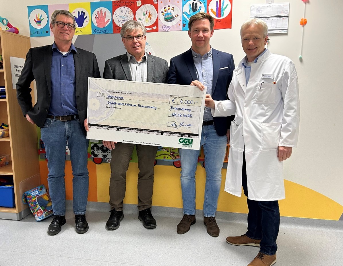 Die Gesellschaft für Grundbau und Umwelttechnik (GGU) bleibt ihrer guten Tradition treu: Wie in den Jahren zuvor spendete das Unternehmen auch 2025 wieder 4.000 Euro an die Kinderklinik des Städtischen Klinikums Braunschweig. Übergeben wurde die Spende am 8. Dezember 2025 von den Geschäftsführern Simon Buß, Dr. Peter Grubert und Dr. Carl Stoewahse an Chefarzt Dr. Andreas Beilken.