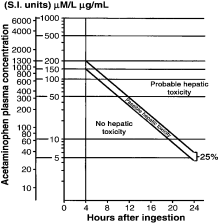 Konzentrationen ab 70-100 µg/ml wirken toxisch, ab 150-200 µg/ml ist mit Koma oder Tod zu rechnen (s. Grafik). Als Antidot steht N-Acetylcystein zur Verfügung, das frühzeitig gegeben werden sollte und bis >1500 mg/l analytisch nicht interferiert. Für Erwachsene sind 10-15 g und für Kinder ggf. bereits 2-7 g hepatotoxisch, insbesondere bei vorgeschädigter Leber. Auch renale tubuläre Nekrosen treten auf. Die Halbwertzeit beträgt ca. 2-3 h; wenn sie 4 h überschreitet, ist eine Leberschädigung wahrscheinlich. Zur Bestimmung der Halbwertzeit darf die erste Probe frühestens 4 h nach Einnahme entnommen werden. Die toxische Wirkung wird nach ca. 24 h manifest und erst nach 3-4 Tagen kann es zu Leberzellnekrosen kommen. Bei ALT/AST-Werten bis 1000 U/l sind i.d.R. keine schweren Konsequenzen zu erwarten. Die Leberschädigung zeigt sich u.a. auch an einem ATIII-, Fibrinogen-, Quick- und CHE-Abfall sowie einem Bilirubinanstieg.